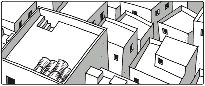 Look at the picture of a house in the city. Draw two persons sleeping on the roof as well as a few bundles of flax stacked in a corner.