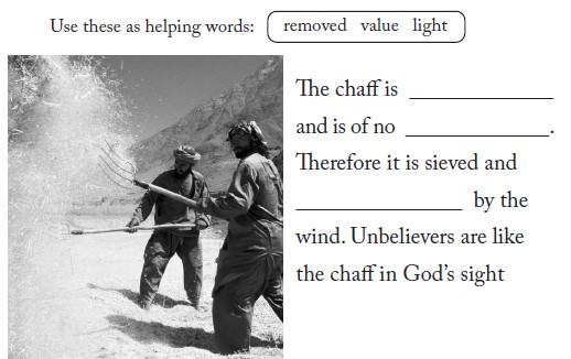 In verse 4, God says they are like the worthless brown chaff that is blown away when the farmer winnows his grain. In the past, when the farmer gathered the wheat, at some stage he would throw up the crop into a strong wind in an open field. This would cause the lighter chaff , which was worthless, to be scattered by the wind. Meanwhile, the useful grain, which was heavier, would fall back to the ground and thus be separated.