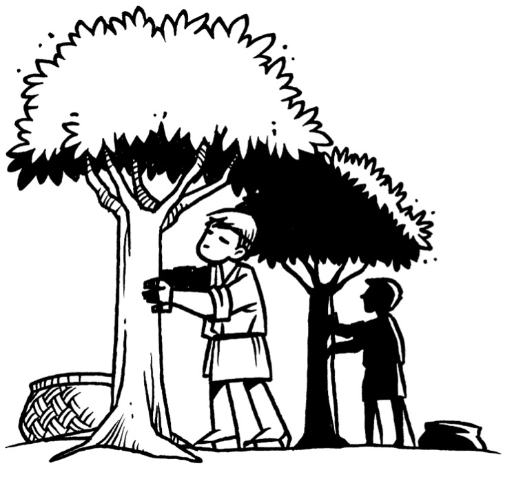 Draw the olives falling, some on the ground, and some into baskets and some remaining on the trees.
